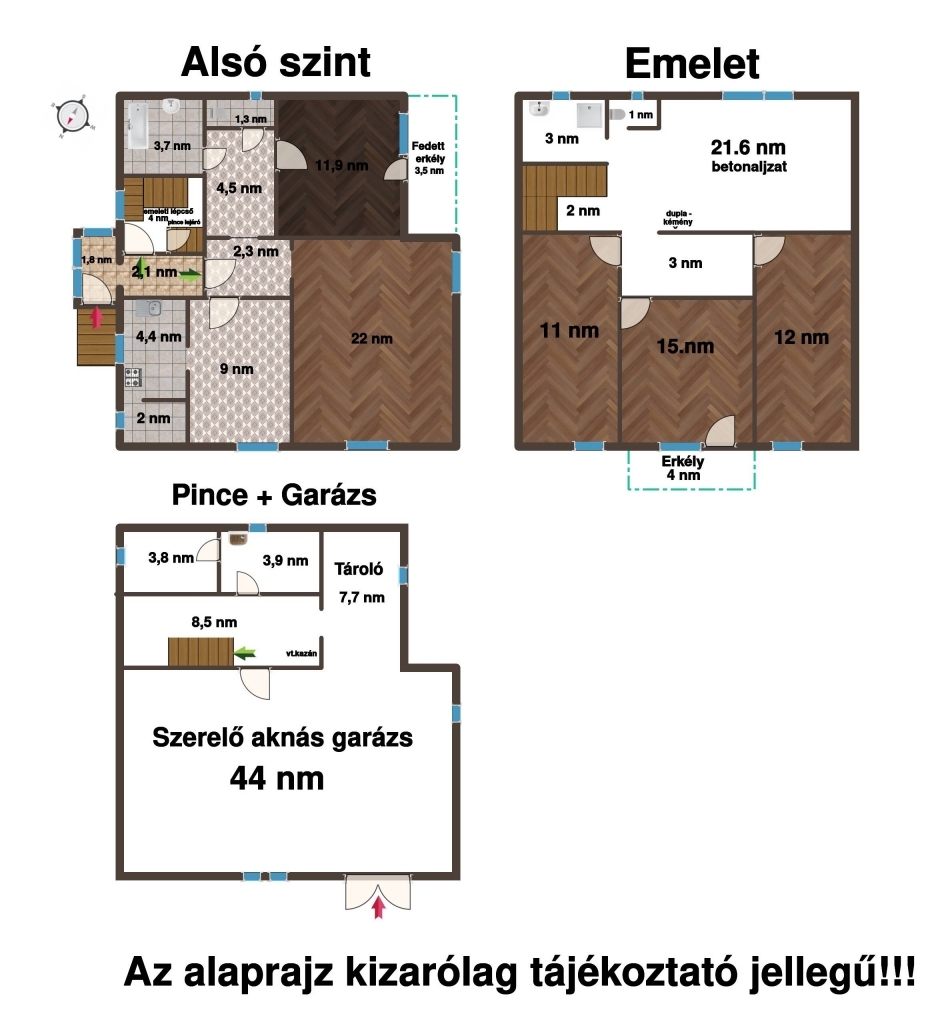 Pince/szuterén és garázs: Lépcső,közlekedő, fa tároló, két tároló helység és a szerelőaknás garázs elektromos garázsajtóval.