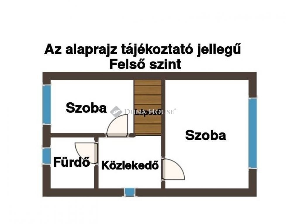 Az alsó szintről masszív, vas szerkezetű, fa lépcsőfokokkal szerelt lépcső vezet a 32,37 nm-es emeletre. A lépcsőn felérve, az előtérbe érkezünk, melyből elérhető a 2 szoba és a fürdő + WC helyiség.