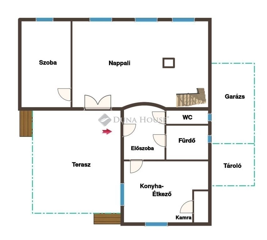 Az L alakú épület 31 m²-es, részben fedett teraszt határol, amelyet zöld növényzet vesz körül, biztosítva a teljes intimitást és védelmet az utcai betekintés ellen.
