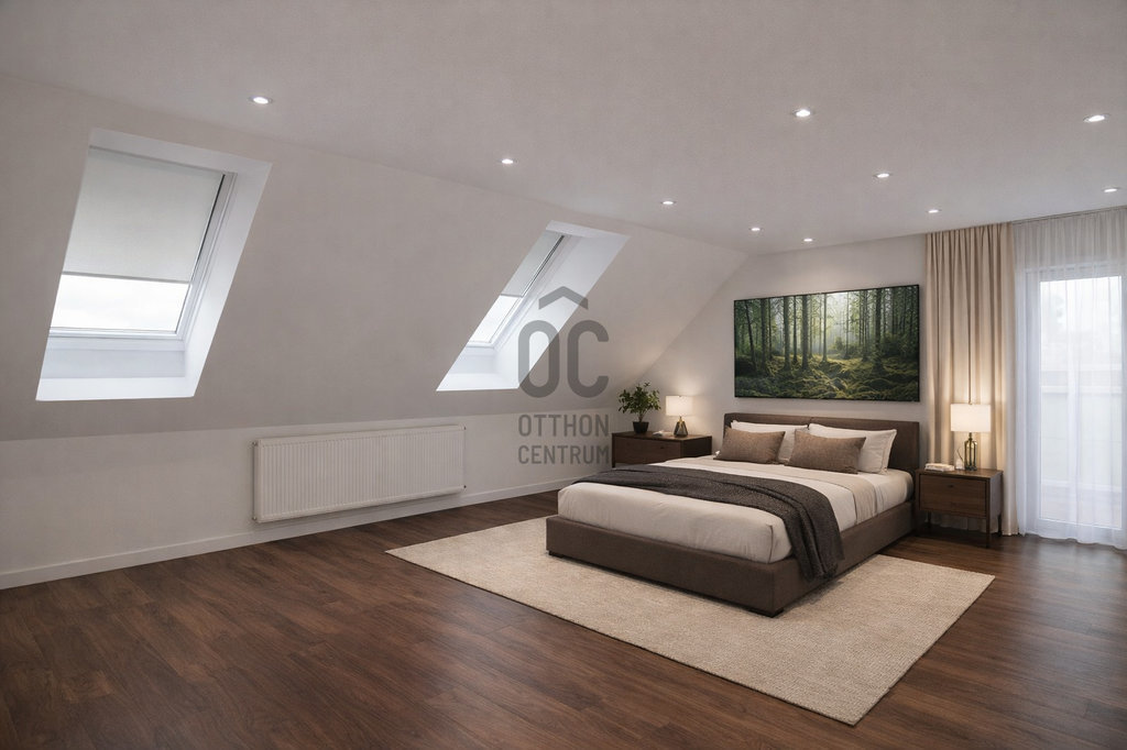A tágas nappali a mindennapok természetes központja, ahol a fény és a tér együtt dolgozik. A felső szinten található hálószobák jól szeparáltak, nyugodt pihenőteret biztosítanak.