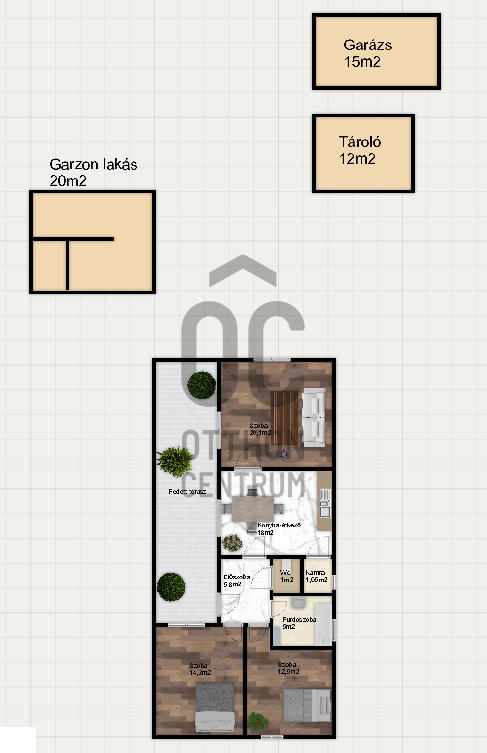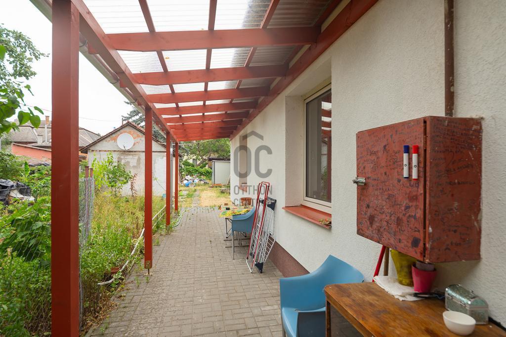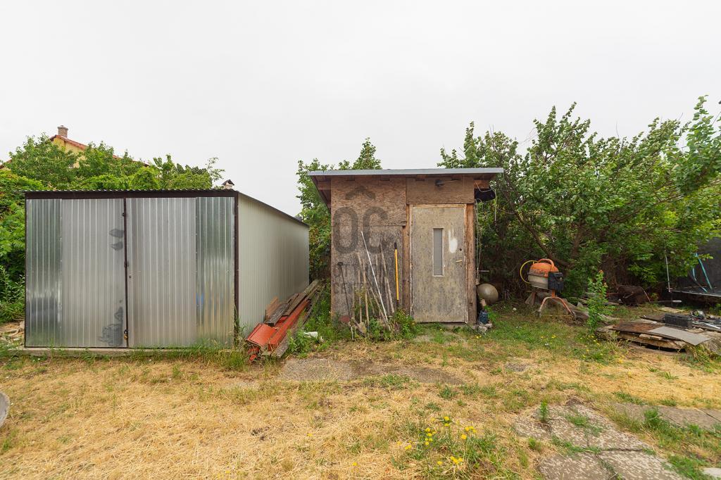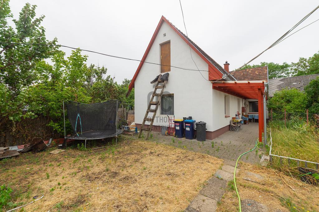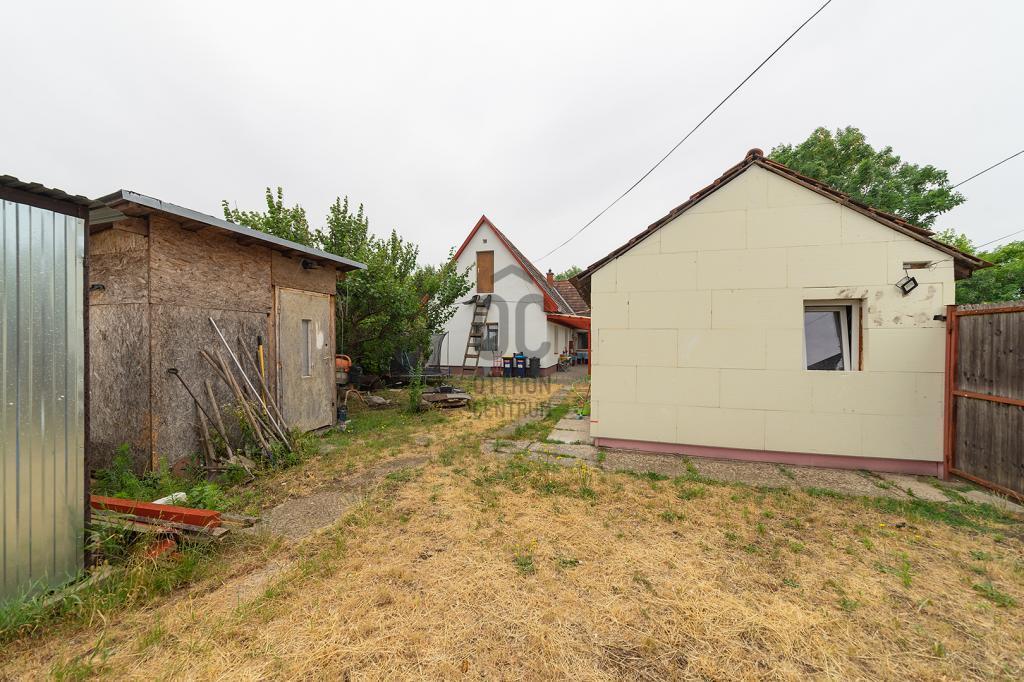 Önálló, elkerített udvarral rendelkezik, melyen egy 20m2-es bérbeadásra szánt garzon, 15m2-es lemezgarázs, illetve egy saját tároló is található. A hirdetésben a ház egyik szobája a képek között nem látható, éppen felújítás alatt áll. A fürdőszoba felújítása is folyamatban.