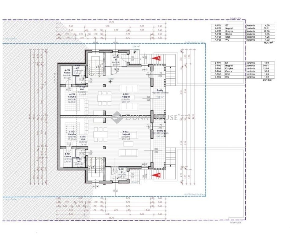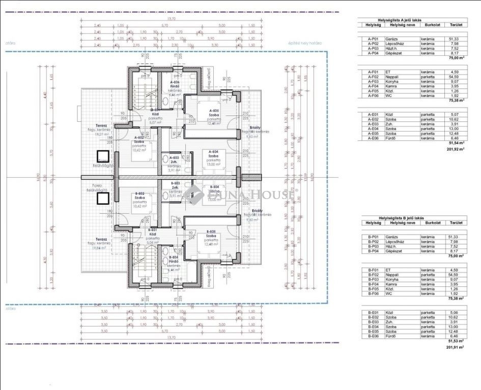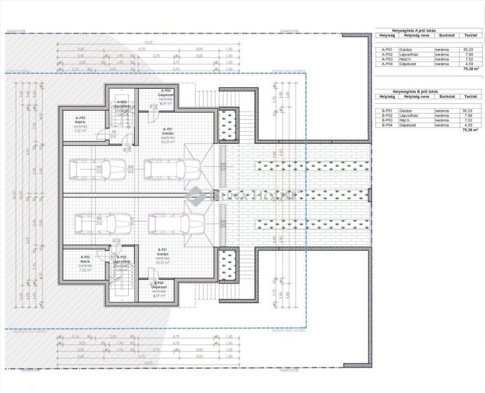 Legalsó szint:Dupla garázs: 55,29 nmHáztatási helyiség: 7,52 nmGépészeti helyiség: 4,59 nmLépcsőház: 7,98 nmFöldszint:Nappali-étkező: 50,81 nmErkély: 9,60 nmKonyha: 13,86 nmKamra: 3,95 nm