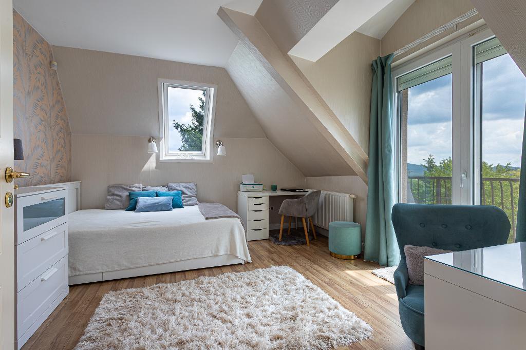 In District II, Budaliget, near the French School, a renovated family house is for sale on a 540 sqm plot, with a living area of 270 sqm. The property is located in a quiet, forest-adjacent setting, offering beautiful panoramic views of the surrounding hills.
