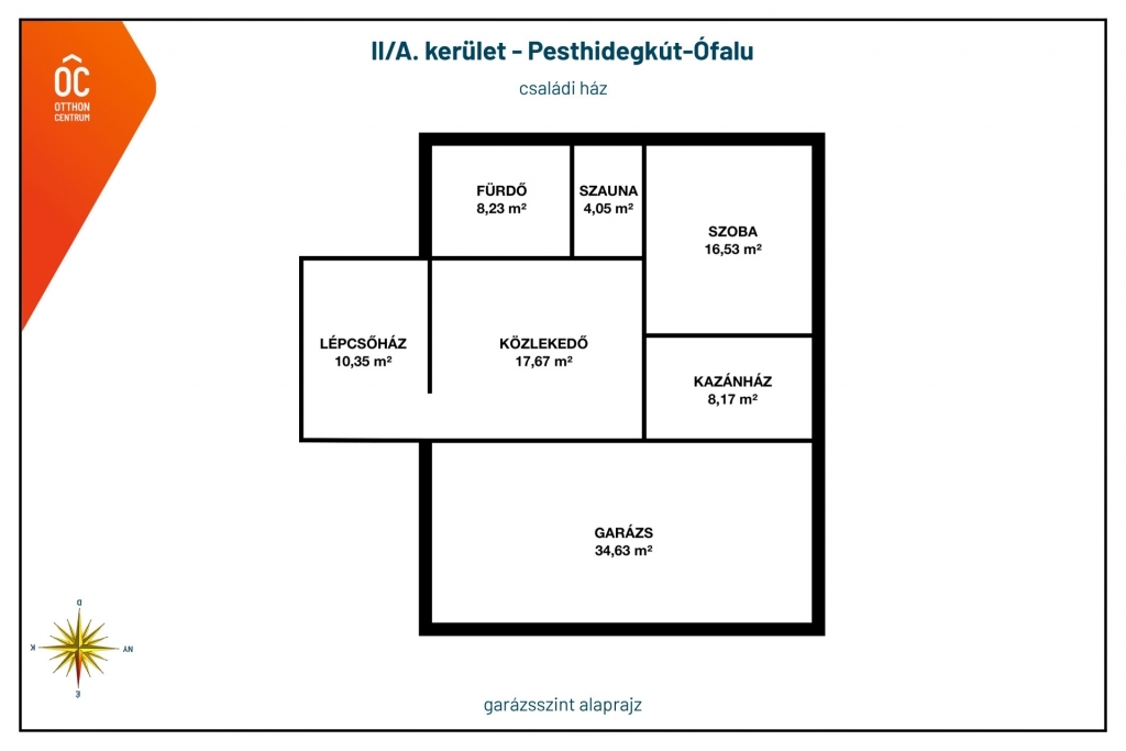 Földszint: garázs, kazánház, szauna, mosókonyha, fűtött helyiség irodának