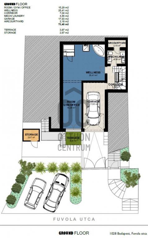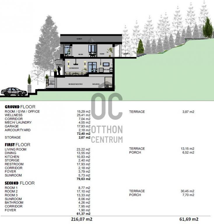 Földszint: garázs, egy szoba (szülői lakosztály/wellness), fürdő, WC, szauna, tároló