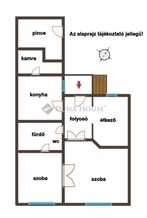Az ingatlan elrendezése két egymásba nyíló szobából, fürdőszobaWC helyiségből, konyhából, külön étkezőből, kamrából és folyosóból áll, továbbá pince és önálló garázs is tartozik hozzá.