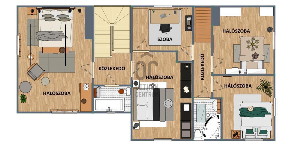 az emeleten 4 + 1 hálószoba, 2 fürdőszoba