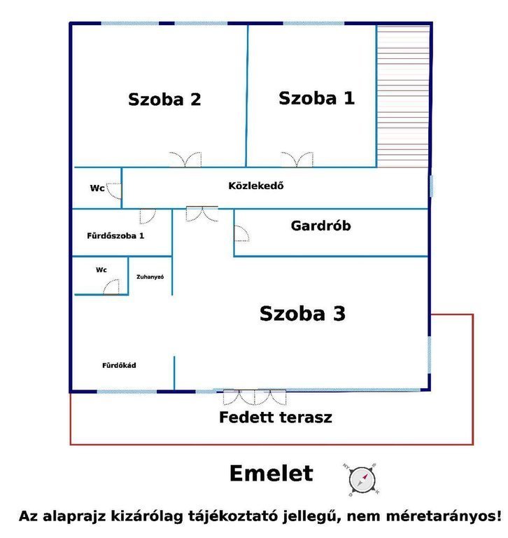A ház praktikus elosztású: nappali + 4 szoba, 2 fürdőszoba és 2 külön WC biztosítja a kényelmes mindennapokat. A délnyugati tájolású nappali világos és tágas, közvetlen kapcsolatban áll a 25 nm-es terasszal.