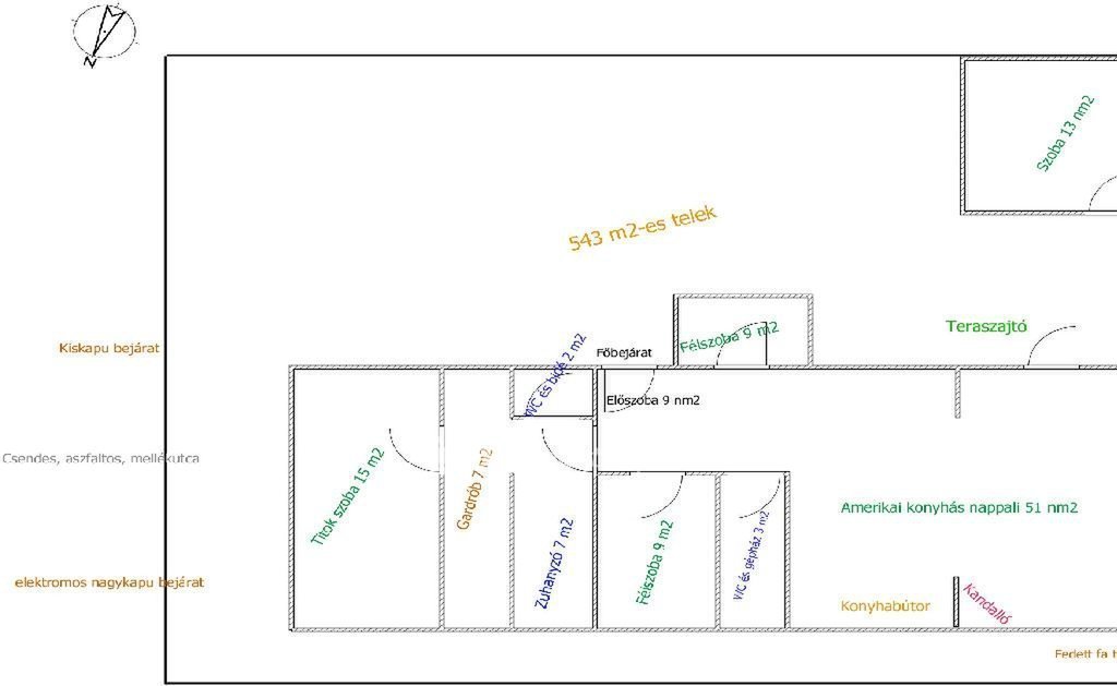 ** Földszint: 2 szoba + 2 félszoba + amerikai konyhás nappali, + zuhanyzós fürdőszoba, 2 Wc + bidé, nagyméretű gardrób.