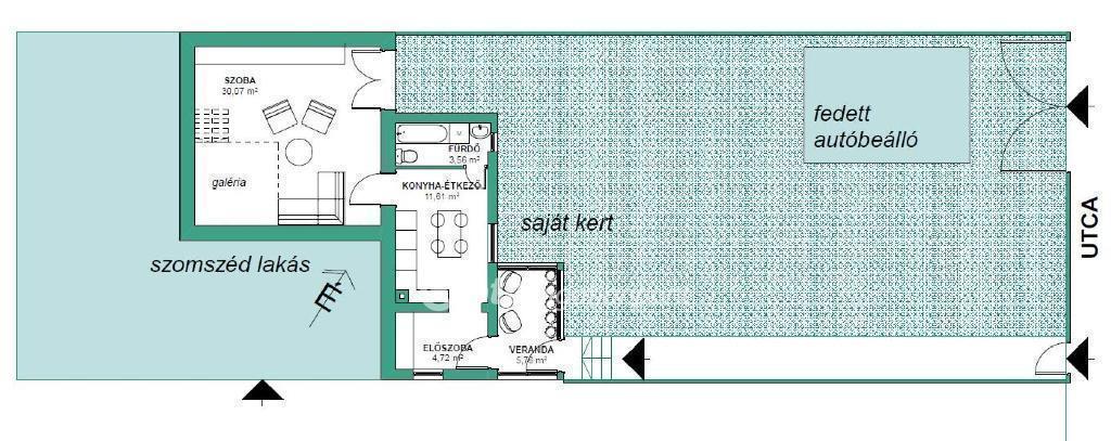 A kerten keresztül érkezünk a bejárati verandára, majd az előszobába. A lakásban egy jól felszerelt konyha-étkező, egy fürdőszoba és egy nagy méretű, nagy belmagasságú, alvó galériával kibővített szoba található. Innen egy terasz ajtón keresztül a kertbe juthatunk.