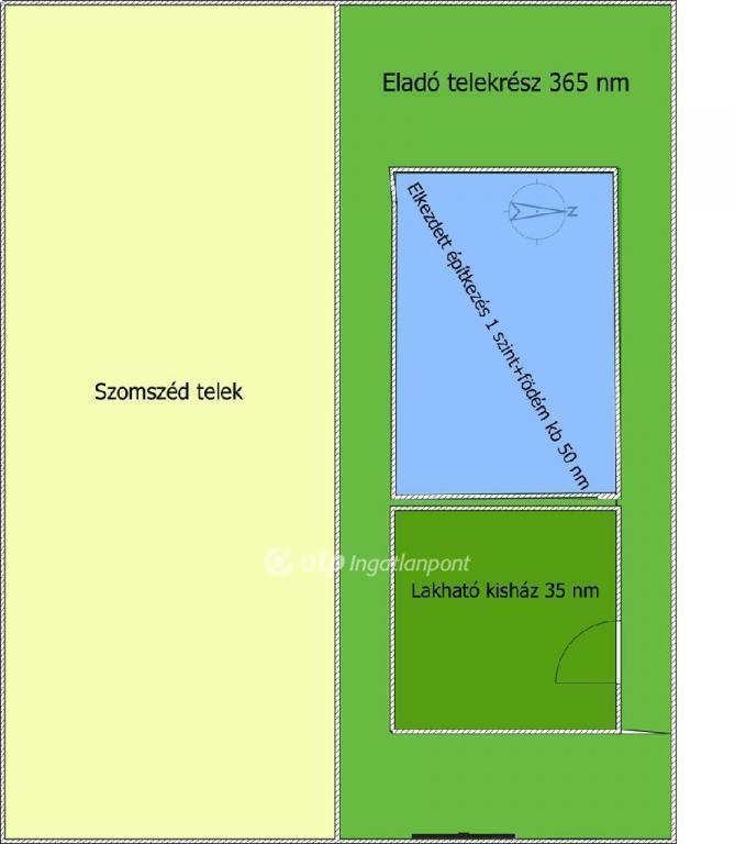 Eladó egy 365 nm-es, rendezett telek, rajta egy 35 nm-es, azonnal használható házzal és egy új építésű, szerkezetkész családi ház alapjaival.