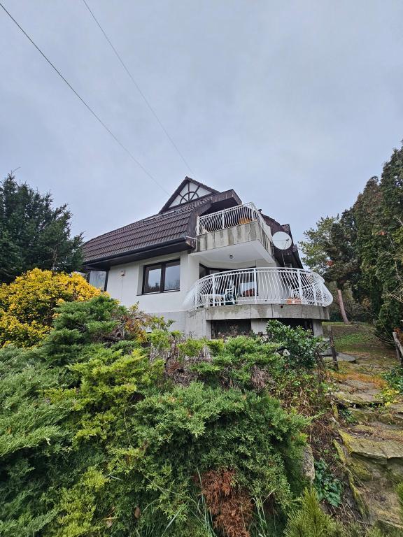 The ground-floor apartment has a garden connection and terrace, while the upper apartment features a balcony with panoramic views of Rózsavölgy.