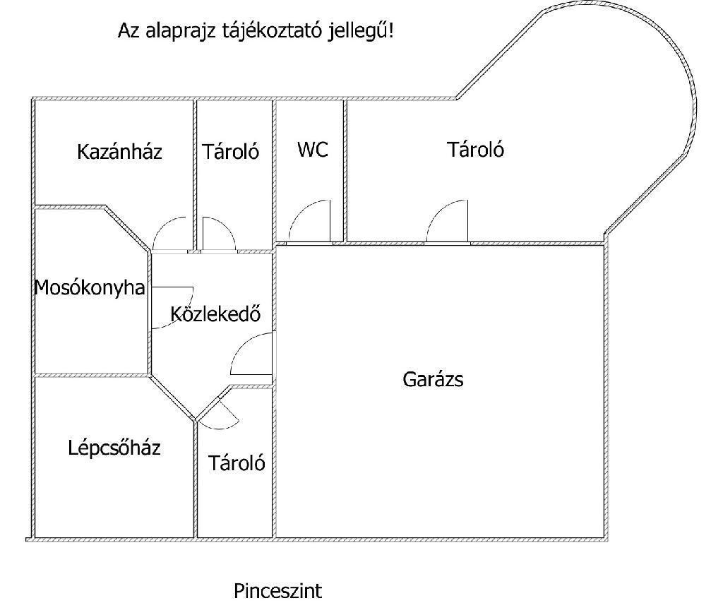 Az alsó szinten garázs és öt különálló tárolóhelyiség található, összesen kb. 90 m², mely akár üzleti célra is hasznosítható.