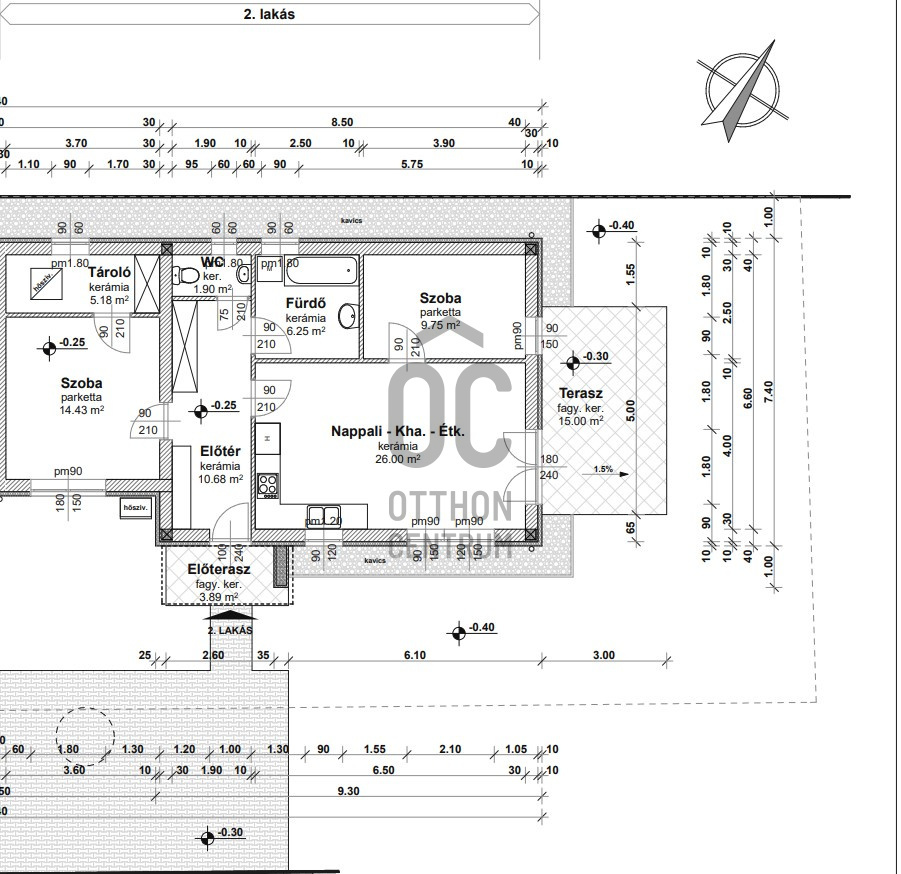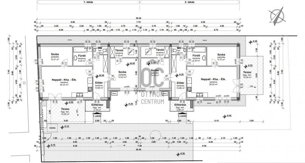 Nettó: 74,5 m2 lakórész + 15 m2 terasz + 4 elő-terasz