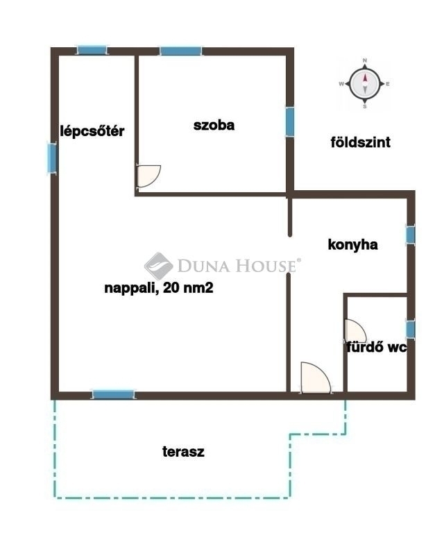 A földszinten található a nappali, konyha, hálószoba és egy kisebb zuhanyzó wc-vel ellátott fürdőszoba.