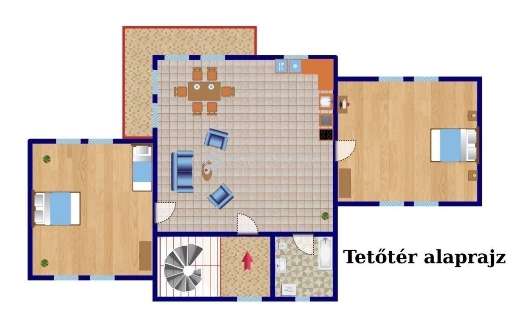 A tetőtér 134 nm (2 hatalmas háló, fürdőszoba, külön WC, nappali+ amerikai konyha).