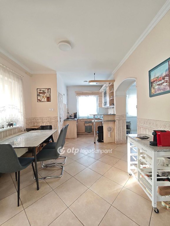 The heating system was renovated two years ago, featuring gas boiler and gas convectors, with average heating costs of approx. HUF 20,000/month. The house is sold furnished, with built-in kitchen furniture and shutters. Parking is available in a gated driveway.