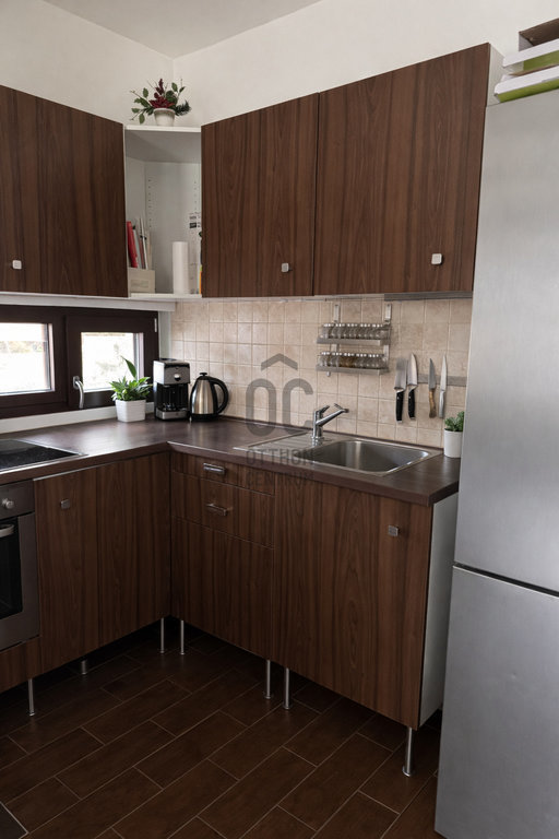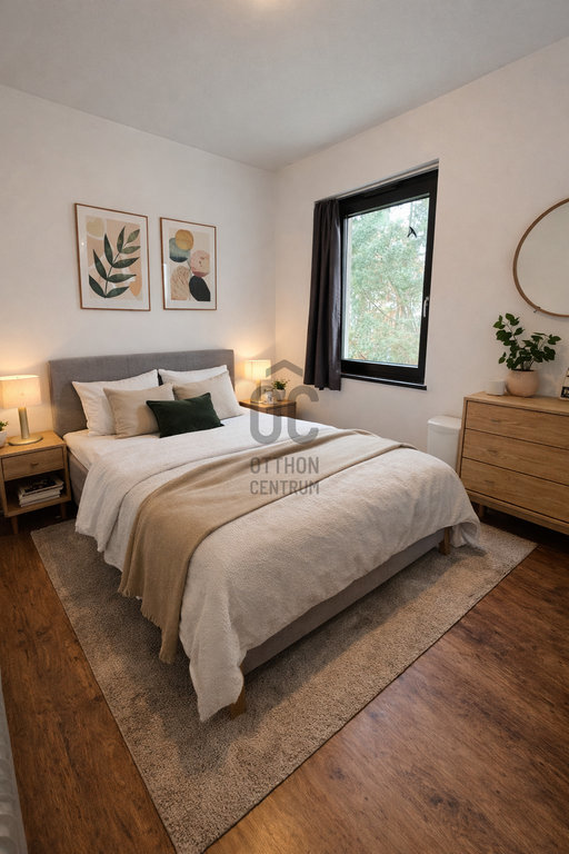 A világos, amerikai konyhás nappali közvetlen kapcsolattal rendelkezik a 20 m²-es déli fekvésű terasszal és a kertre néz, így a pihenés vagy vendéglátás is könnyedén megoldható. A földszinten szintén található két hálószoba, fürdőszoba és egy praktikus éléskamra.
