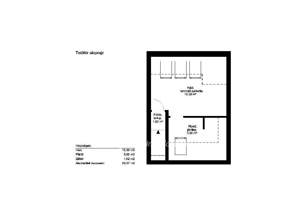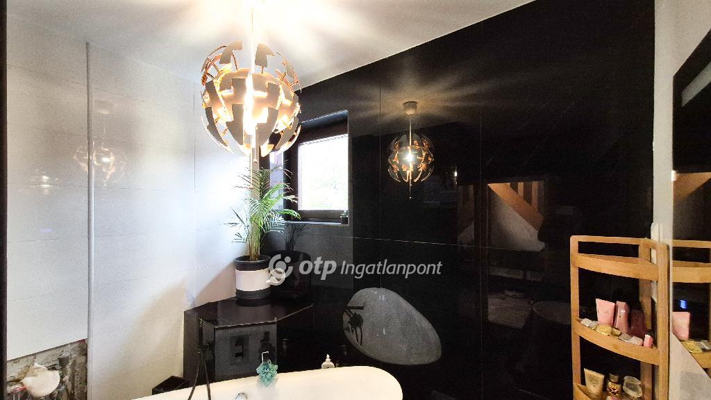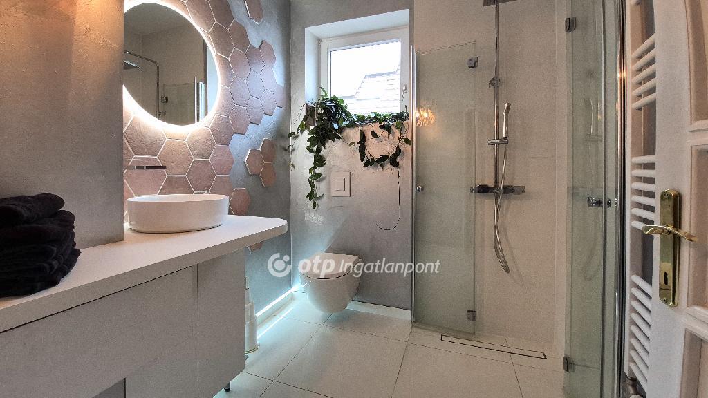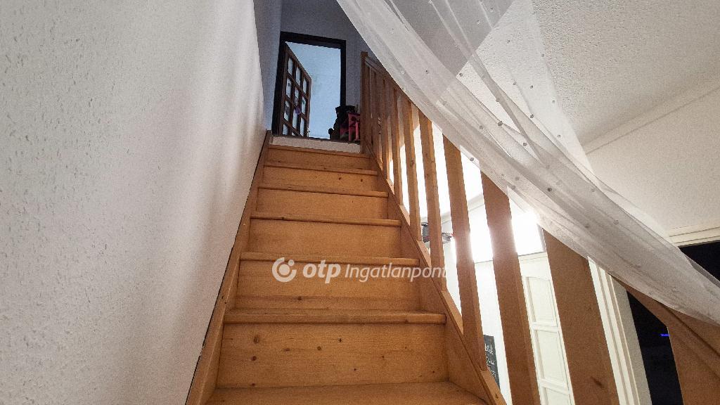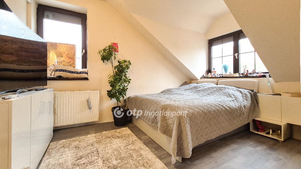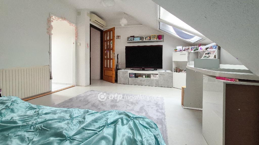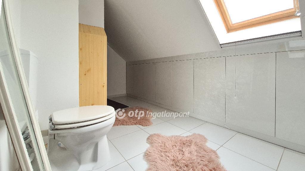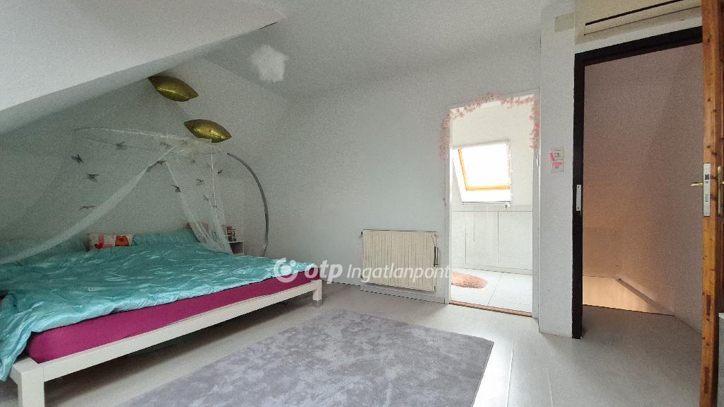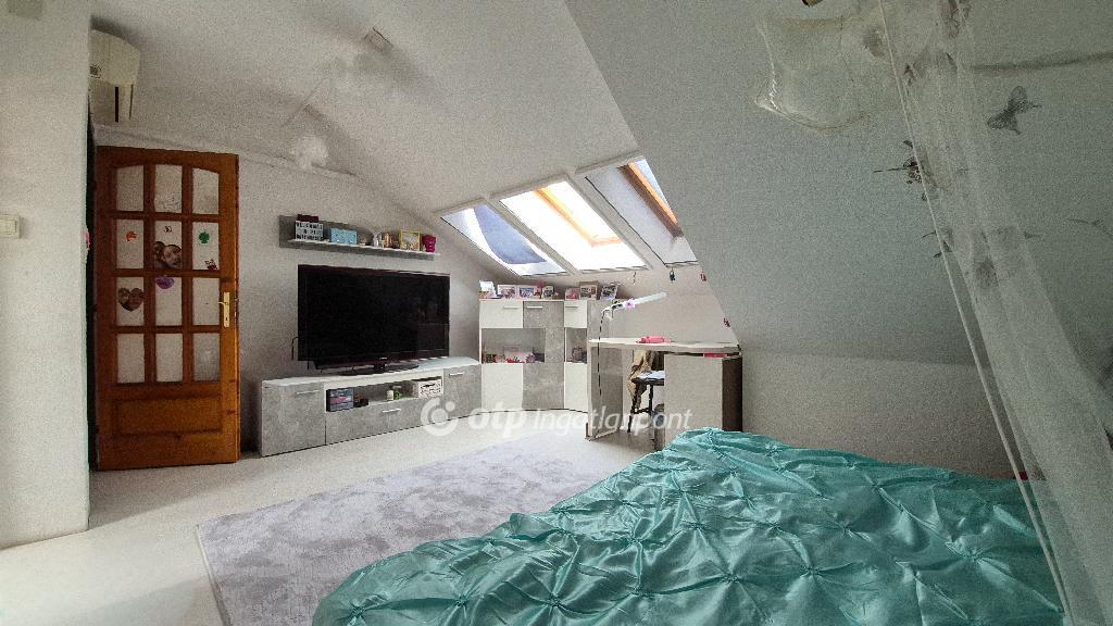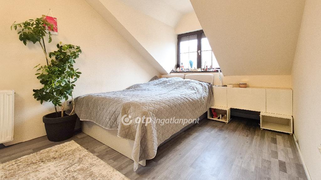 A közlekedőből vezető lépcsőn juthatunk fel a beépített tetőtérbe, ahol egy további világos, tágas hálószoba, és a hozzá tartozó gardrób és zuhanyozós fürdő található.