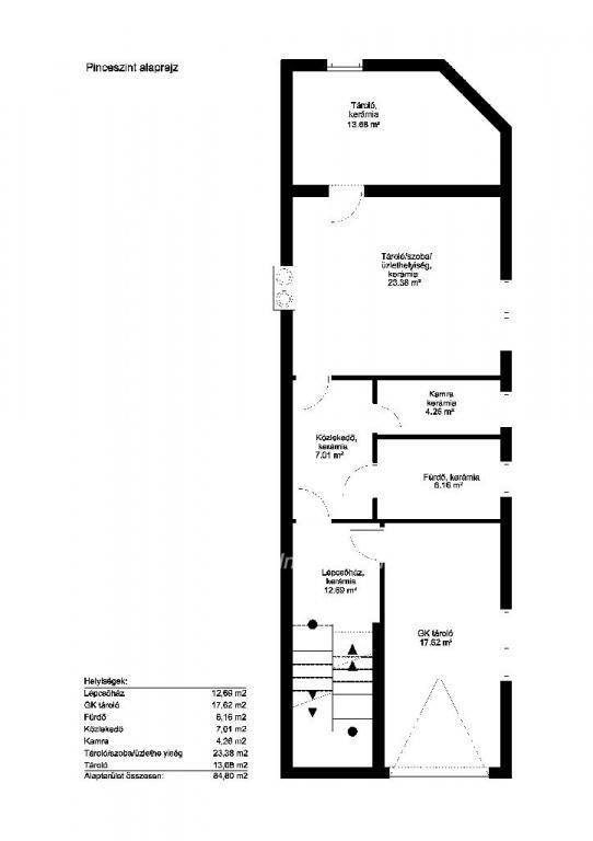 A ház teljesen alápincézett. Ezen a szinten található a garázs, vizes helyiség, kamra, egy nagyobb és egy kisebb tároló (szoba). Az egyik most mosókonyhaként is funkcionál. A pince jól szigetelt, száraz. Minden helyisége ablakkal is rendelkezik, így lakótérként, további hálószobaként vagy üzlethelyiségként is hasznosítható.