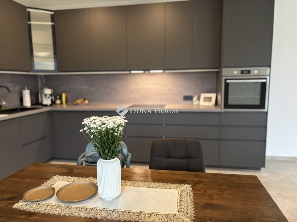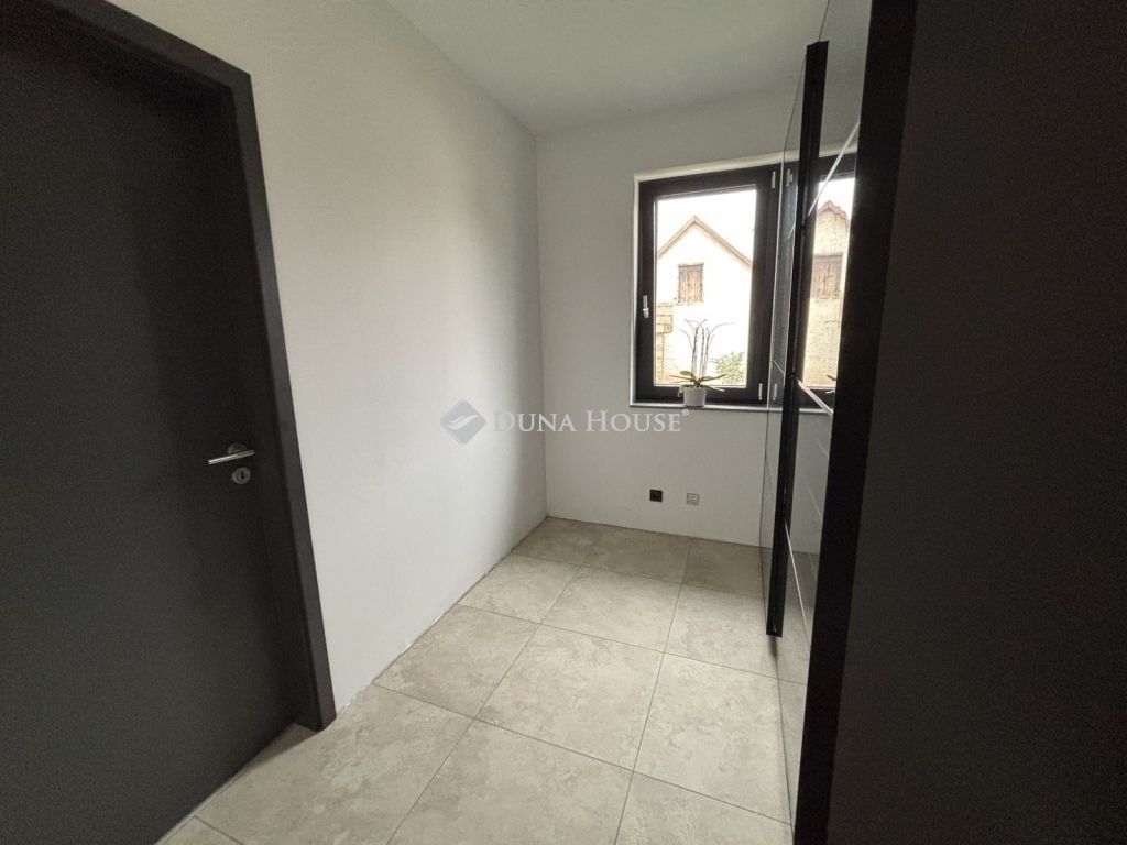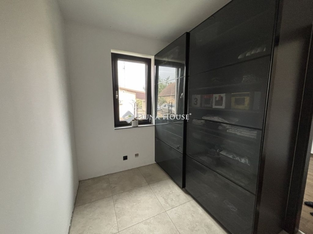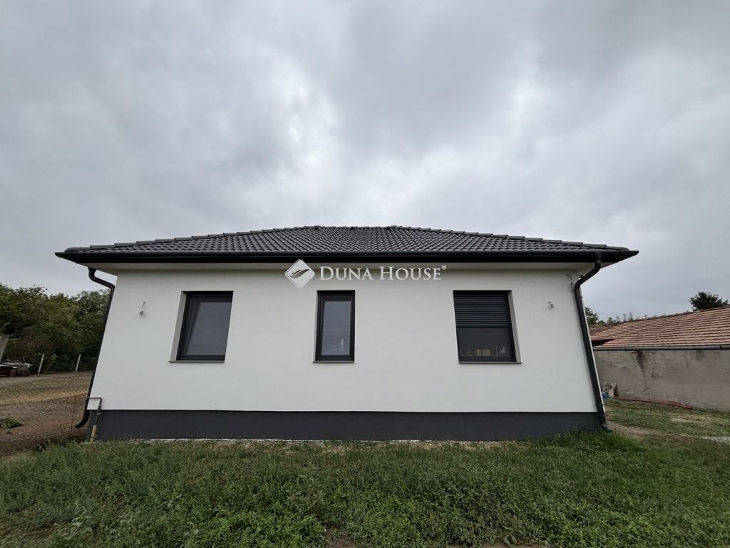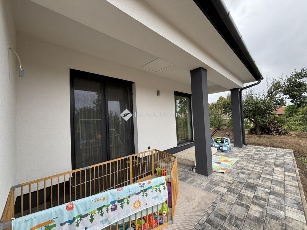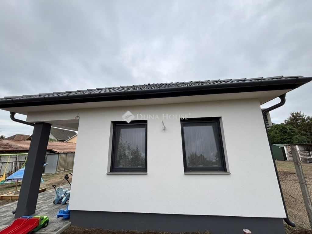 874 m²-es telken, (önálló helyrajzi számon nyilvántartott) 106,86 m² alapterületű, tégla fő- és válaszfalakkal épült, nappali + 3 szobás családi ház várja új tulajdonosát.Modern, okos családi ház eladó csendes környékenFőbb jellemzők:-Teljes körű LOXONE okosotthon rendszer: fűtés, redőnyök és riasztórendszer, amely szabadon bővíthető, és távolról (telefonról) is vezérelhető.-Energiatudatos működés: 3,4 kW napelem rendszer, kondenzációs gázkazán és szobánként külön szabályozható padlófűtés.-Klímakomfort: Daikin Comfora hűtő-fűtő klíma (3,5 kW) + előkészítés további egységhez (hálórész).-Biztonság: kültéri IP kamera (TP-Link, mobilról elérhető) és riasztórendszer.-Prémium nyílászárók: 3 rétegű, GEALAN S9000 ablakok, kívül-belül antracit színben, elektromos alumínium redőnyökkel és szúnyoghálóval.-Időtálló részletek: színezett alumínium ereszcsatorna, kívül-belül műkő párkányok.Belső kialakítás:-Teljesen gépesített IKEA konyha, és PAX gardróbszekrény.-Geberit dupla mosdós fürdőszoba szekrény fűthető Geberit Xeno tükörrel.-Geberit rimless fali WC-k.-Full Doors CPL fóliás ajtók tömör faforgács betéttel.-Bette 180x80 titánacél kád, Hansgrohe csaptelepek.Telek és környezet-Privát, nyeles telek, csendes elhelyezkedéssel, teljes nyugalmat biztosítva.-30 m²-es térkövezett terasz.-Fúrt kút és kerti csap.-6 m²-es kerti tároló pincével.Az udvar végső kialakítása az új tulajdonosra vár.Ez az ingatlan a modern technológiát, az energiatakarékosságot és a kényelmet ötvözi ideális választás, ha biztonságos, jól felszerelt, trendi, okos otthont keresel nyugodt környezetben.