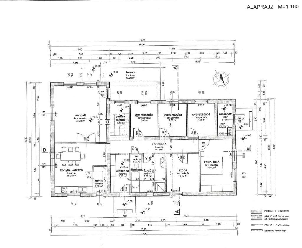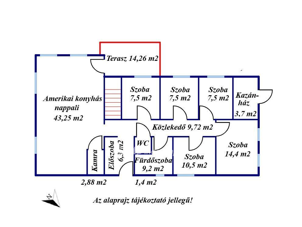 - Helyiségek: szoba, 4 félszoba, amerikai konyhás nappali, fürdőszoba, külön WC, kamra, lépcsőház, kazánház, közlekedő
