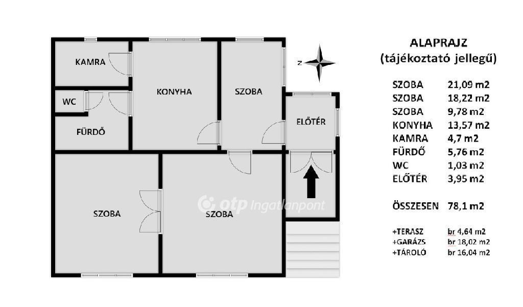 A ház lakóterülete 78,1 m², amelyhez további helyiségek – garázs, tároló/műhely és fedett terasz – kapcsolódnak, így összesen közel 100 m² hasznos tér áll rendelkezésre. A belső térben három szoba, egy tágas konyha, fürdőszoba, kamra és egy előtér található, amely akár télikertként is használható.