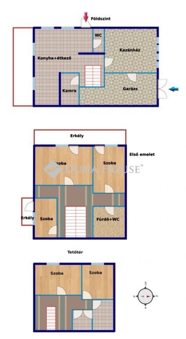 A földszinten egy 33,5 m²-es konyha-étkező, kamra, külön WC, 20,6 m²-es kazánház és 22 m²-es beépített garázs található. Az emeleti szinteken jól használható méretű szobák, fürdőszobák és közlekedők kaptak helyet, így a ház elosztása praktikus és családbarát. A konyhából nagy terasz nyílik a kert felé, a telek hátsó részén pedig állattartásra alkalmas melléképületek is megtalálhatók.