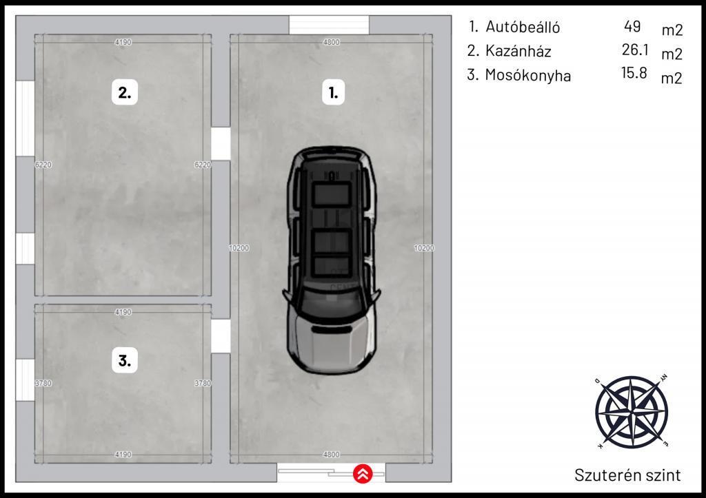 ️ A szuterén szint összesen 101 m2 alapterületű, három helyiségre osztott, garázs + kazánház + mosókonyha.