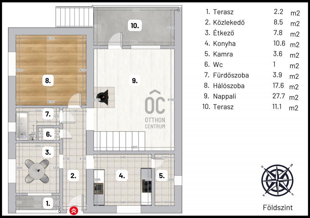 A 10.6 m2-es ablakos konyhából nyílik egy kamra és a folyosóról egy külön étkező helyiség is.