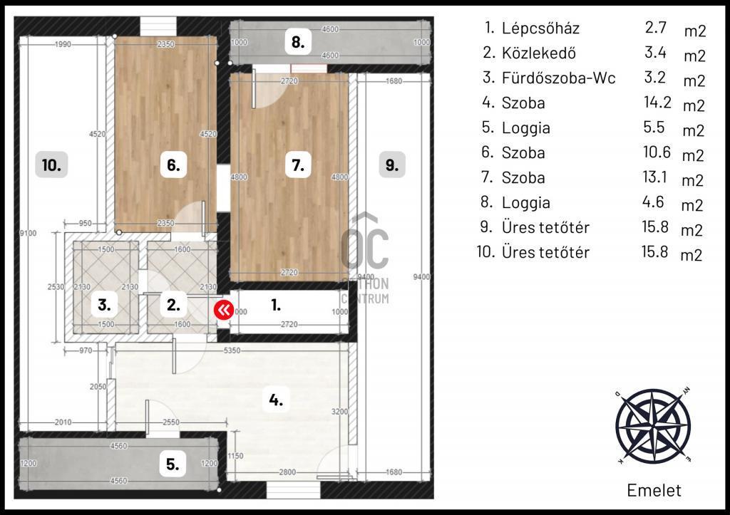 ️ Felosztása: lépcsőház, közlekedő, fürdőszoba-WC, 2 db külön nyíló hálószoba 1-1 saját loggia.