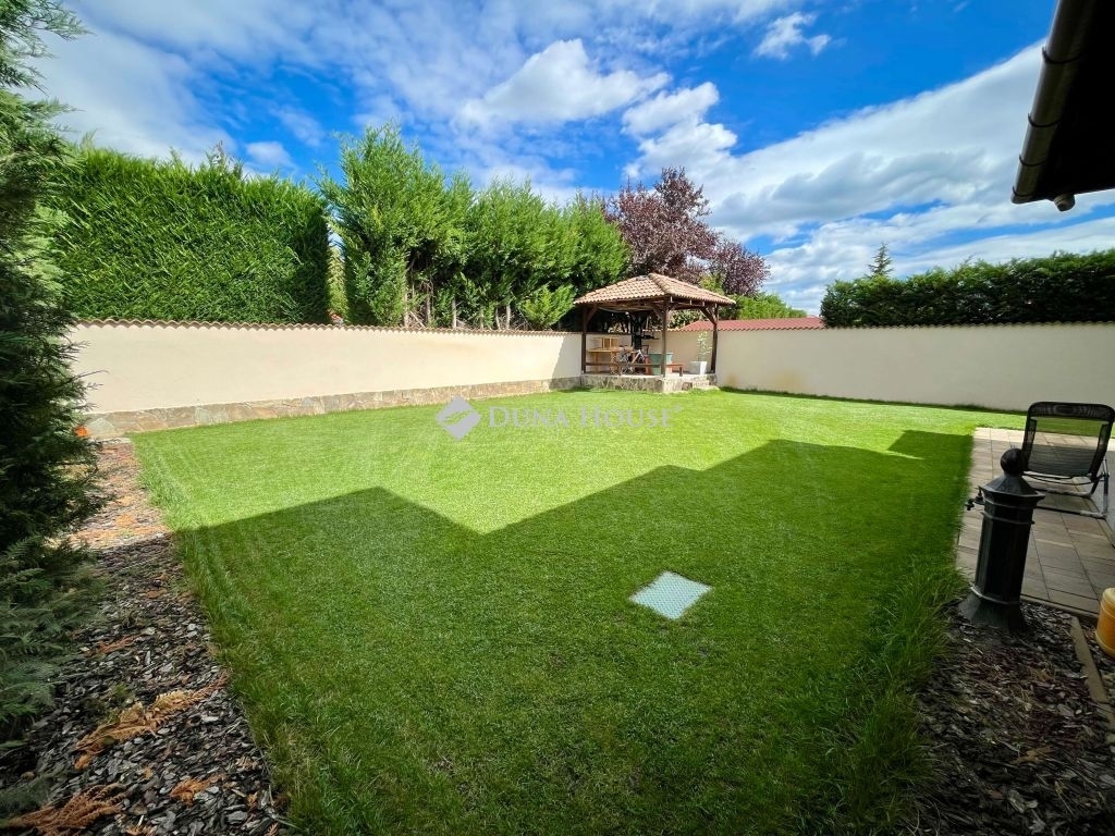 A programozott öntözőrendszer a gyönyörű gyepszőnyeget gondozza, amely alatt faháncs található és amelyet vakondháló véd a kert így egész évben tökéletes állapotú.
