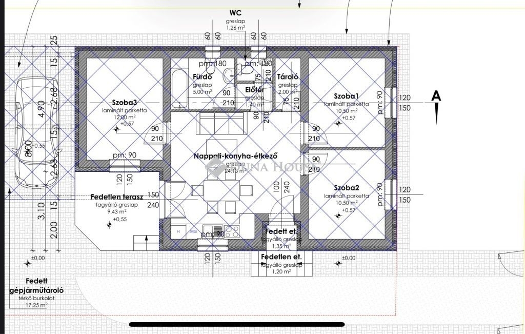 fedett gépkocsitároló: 17,10 m2