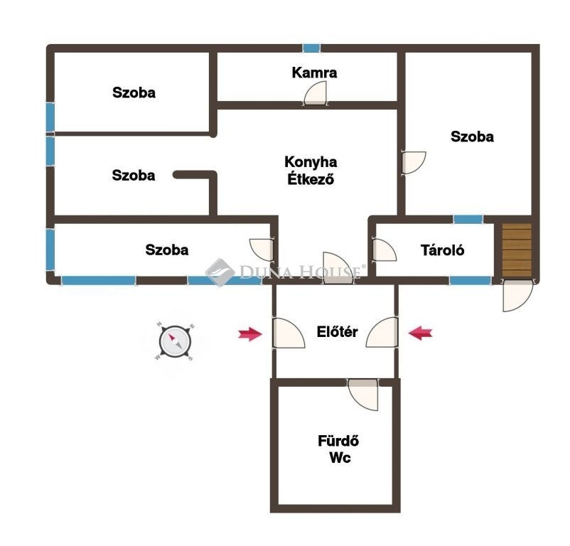 Helyiségei: 1 + 3 fél szoba, konyha-étkező, kamra, tároló, előtér, fürdő-wc.