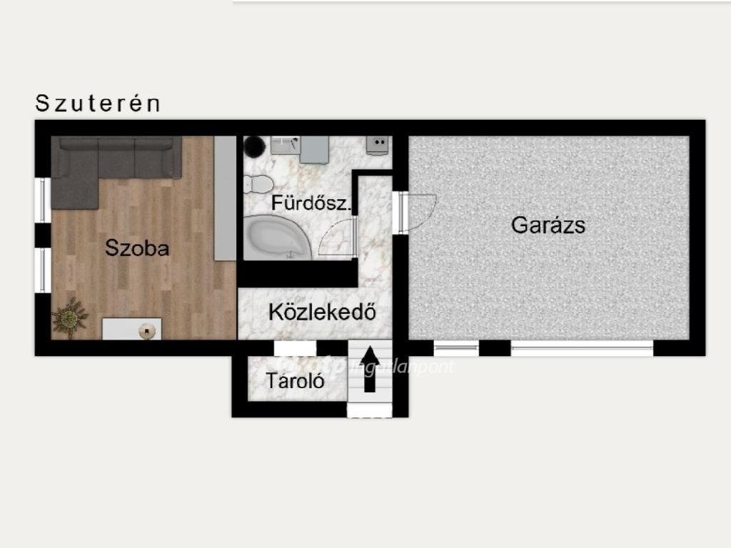 Amennyiben az előszobából a lefelé vezető néhány lépcsőfokot választjuk, akkor a szuterén szintre érkezünk. Itt foglal helyet egy tágas szoba (17,6 m2), nagy fürdőszoba Wc-vel, tároló és innen is megközelíthető a hatalmas garázs.