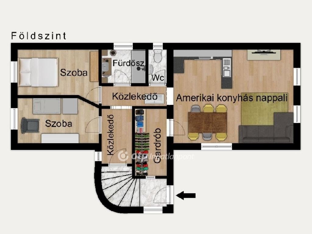 Beosztását tekintve: az előszobából felfelé haladva pár fok lépcsőn át jutunk a földszintre. Itt egy rövid közlekedőből nyílik a 2 hálószoba (8,8 m2 és 9,7 m2), fürdőszoba, külön a Wc, valamint egy igen nagy, világos, amerikai konyhás nappali (29,7 m2), amin keresztül elérhető a tárolásra használt gardrób helyiség.