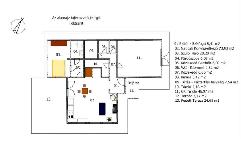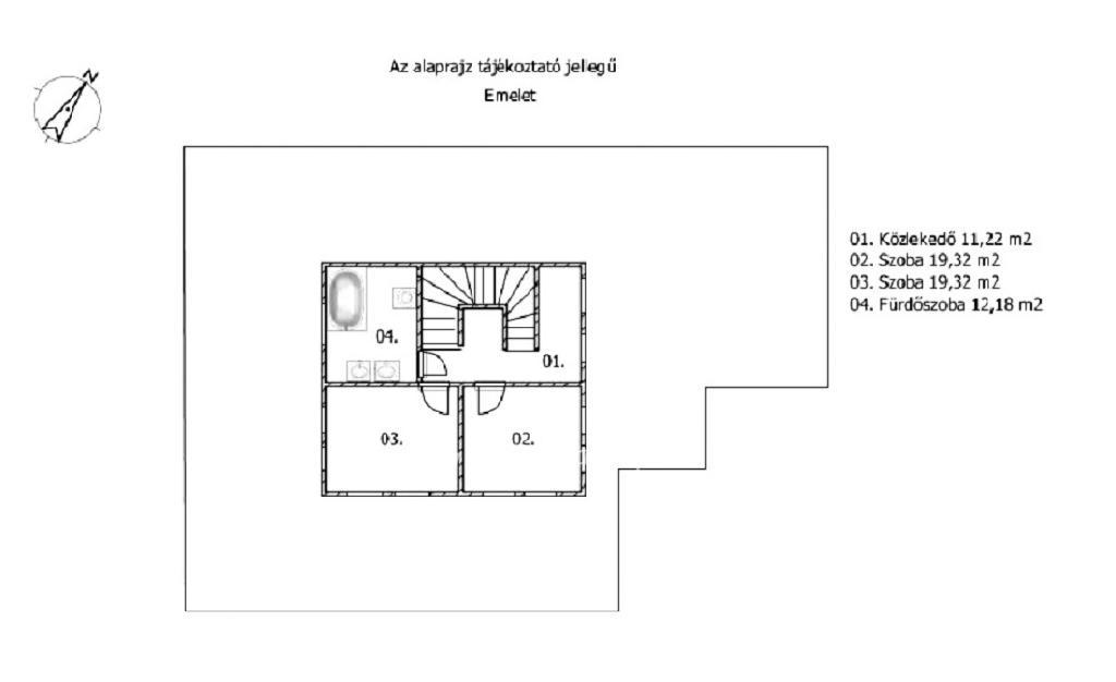HELYISÉGEI: A földszinten található 73,93 m2-es Nappali - konyha - étkező. Innen nyílik a szülői lakosztály: hálószoba 20,20 m2 + épített zuhanyzós fürdőszoba WC-vel és bidével 6,09 m2 + gardrób 6,09 m2. Ez összesen 32,38 m2. A földszinti részen található még a háztartási helyiség 7,54 m2, kamra 3,42 m2, a tároló 4,16 m2, különálló WC bidével és kézmosóval 2,52 m2, az előszoba 8,41 m2, valamint a két állásos garázs, ami 46,97 m2. Az emeleten található két darab 19,32 m2-es szoba, a közlekedő 11,22 m2, valamint a kádas fürdőszoba WC-vel és bidével, ami 12,18 m2-es.