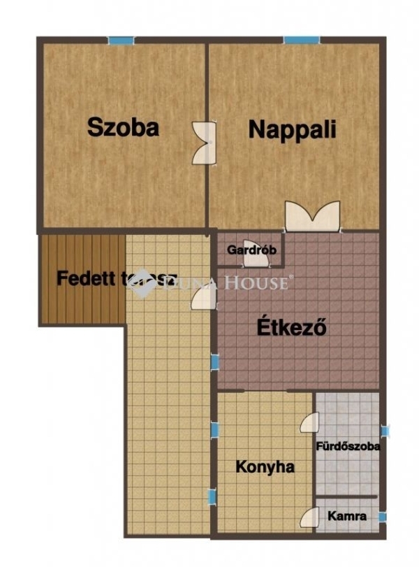 A ház 2 szobával, egy konyhával és étkezővel, valamint fürdőszobával, kamrával és egy kisebb gardróbbal rendelkezik.