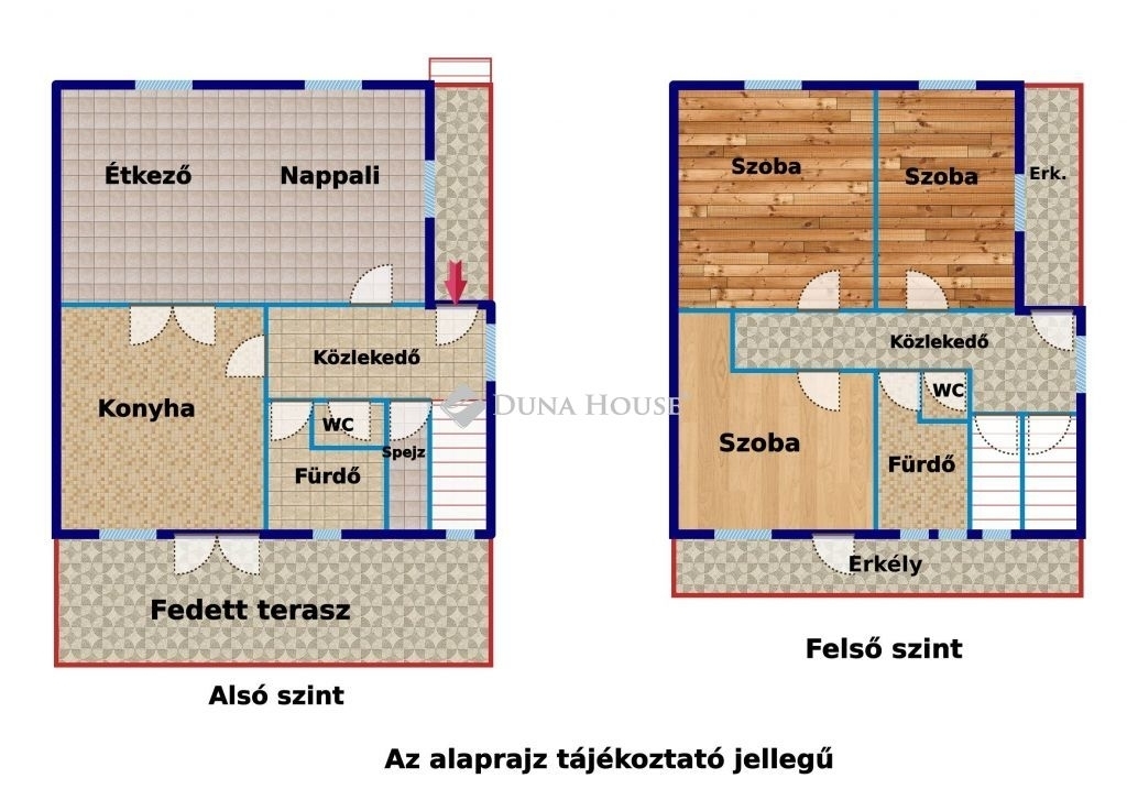 Az alsó szinten található a tágas, napfényes nappali-étkező, a kertkapcsolatos konyha, továbbá egy fürdő, WC és kamra. A felső szinten 3 szoba, fürdő, mellékhelyiség, valamint padlásfeljáró kapott helyet. Igény szerint a padlástér is beépíthető, így további szobák alakíthatók ki.