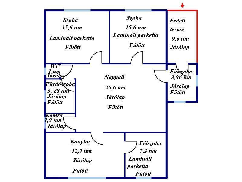 Az ingatlan helyiségei: egy 25,6 nm-es nagy nappali, kettő 15,6 nm-es szoba, egy 7,9 nm-es félszoba, egy 12,9 nm-es konyha, egy 3,28 nm-es fürdőszoba, külön bejáratú WC, egy 2 nm-es kamra és egy 4 nm-es előszoba.