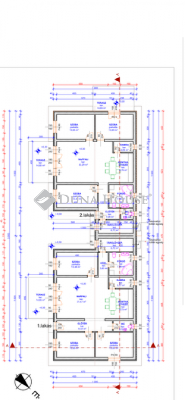 Kialakítása: 3 szoba, nappali, konyha+étkező, előtér, közlekedő, fürdő, külön wc, kamra, tároló, 15 m2 nyitott terasz.