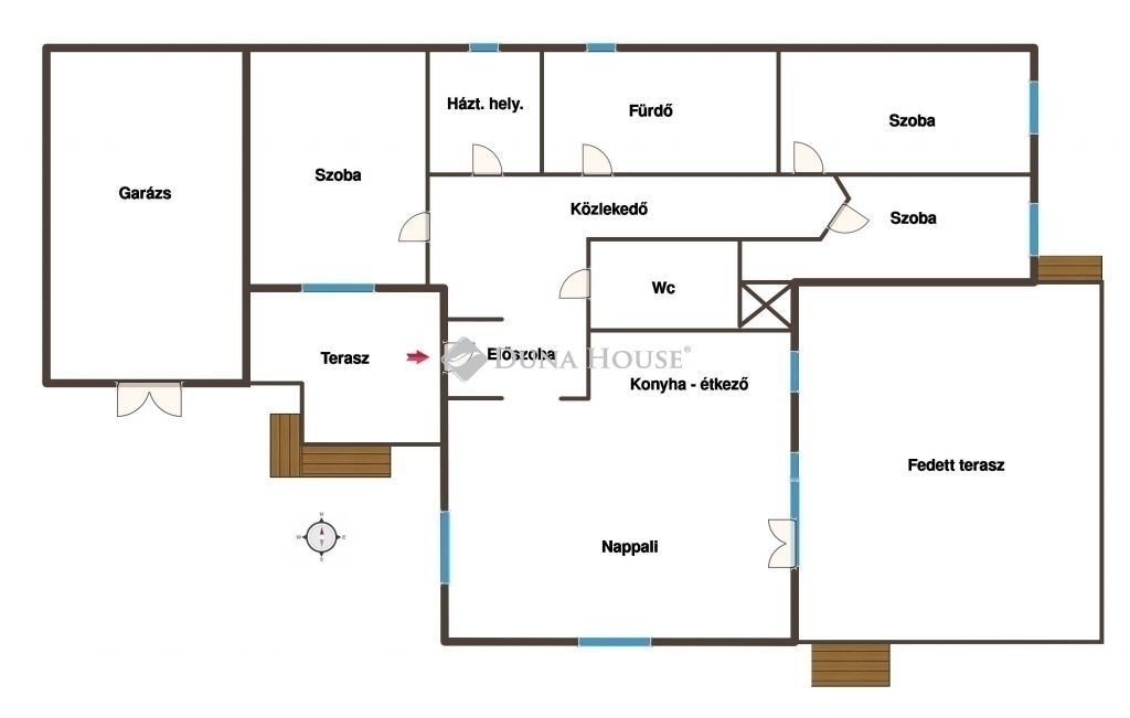 Elrendezés: tágas nappali-étkező-konyha + 3 külön nyíló szoba