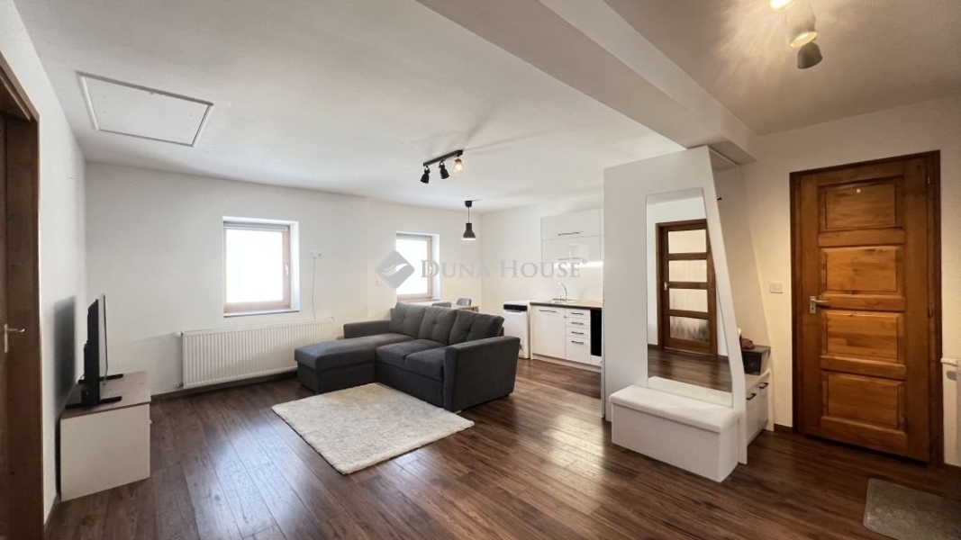 A két fél szoba ideális elrendezést kínál fiatal párnak, kis családnak, illetve akár alkalmas dolgozószoba kialakítására is.