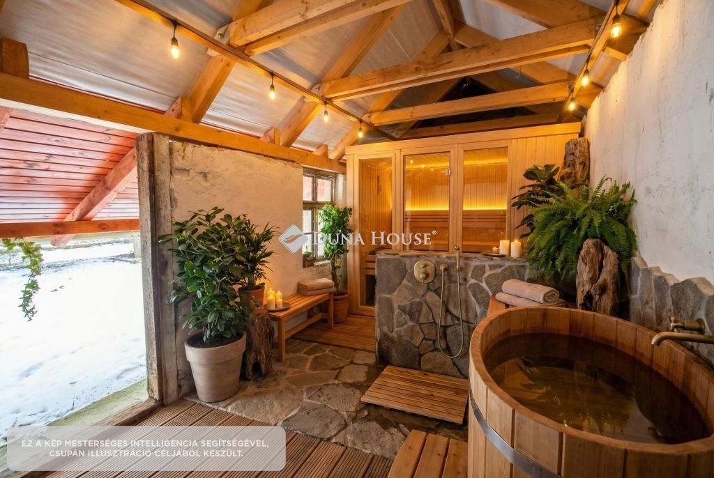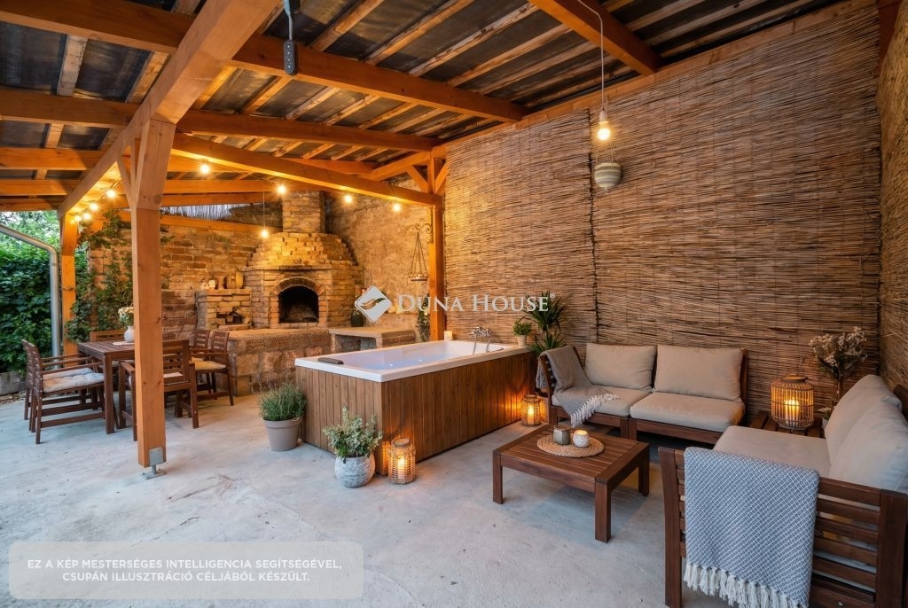 A 562 m²-es telek valódi pluszt ad: nagy udvar fedett terasz ahol már megkezdődött egy kemence kialakítása (AI kép), kültéri wellness, szauna kialakítására alkalmas épületrész (AI kép), pince, garázs (25 m²), több autó számára is kialakítható beállási lehetőség