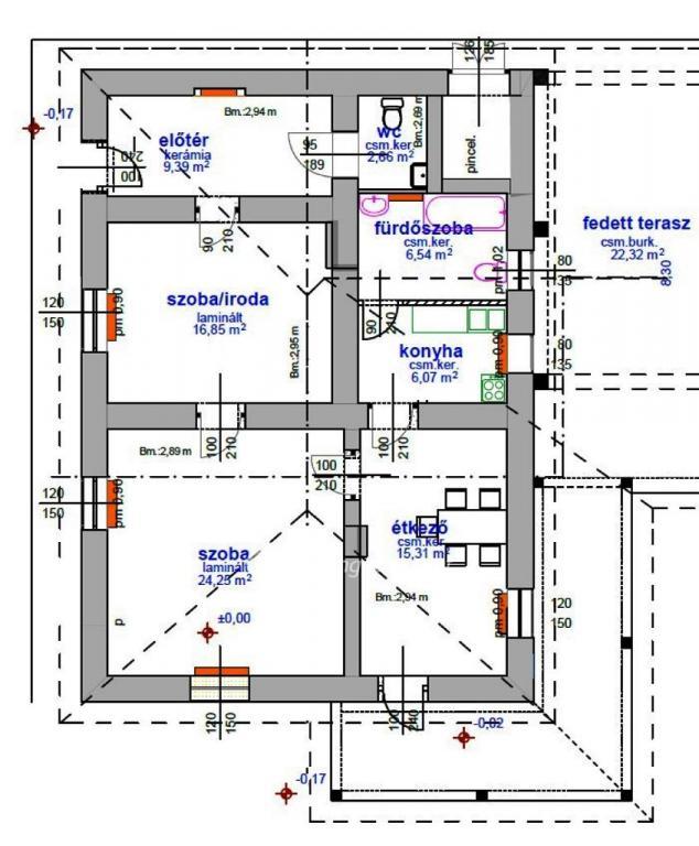 Helyiségek: régi épület: 80,07 m2, köztük: 22,32 m2 fedett terasz, új épület: 113,27 m2, tornác 66,15 m2. 1. épület: 2 szoba, konyha, étkező, fürdő+WC, plusz külön WC, előtér. 2. épület: 3 szoba (előtér-konyha, konyha-étkező, 3 zuhanyzó-WC egyben. A ház alatt egy 25,3 m2-es pince!!!