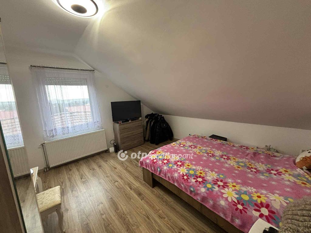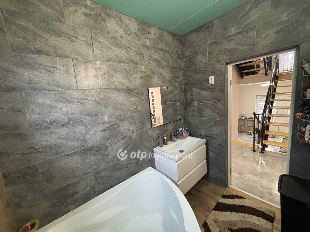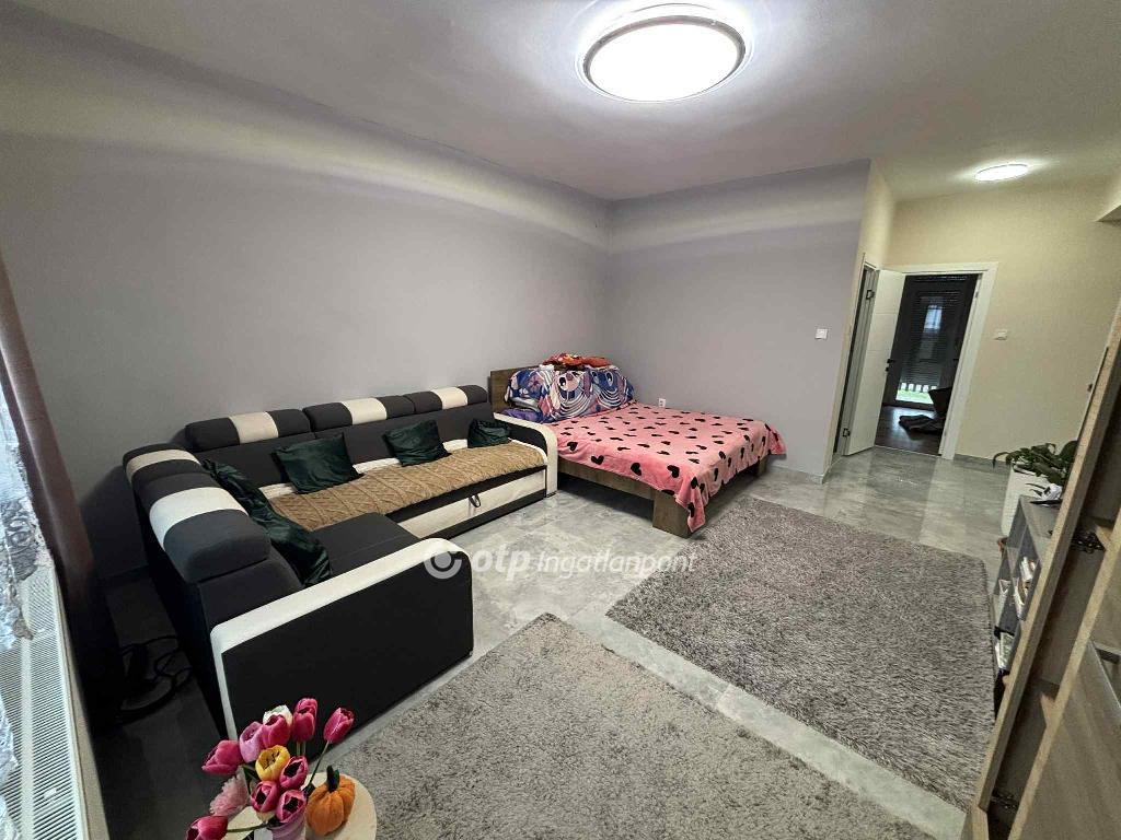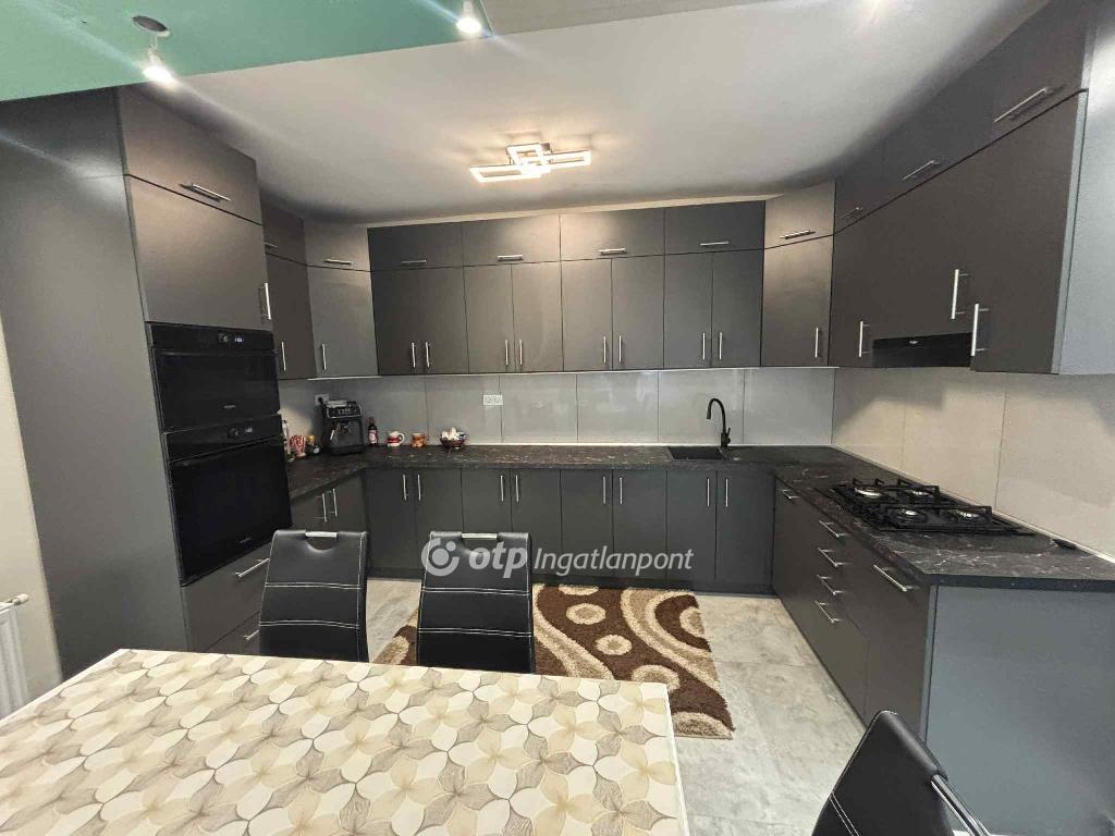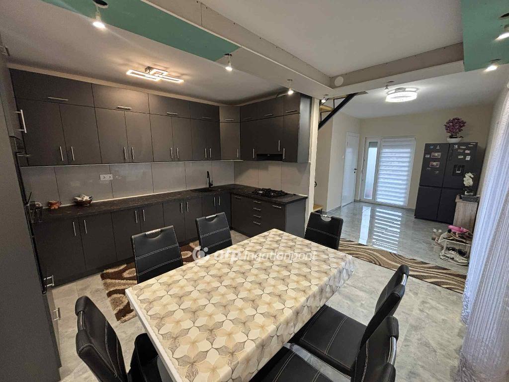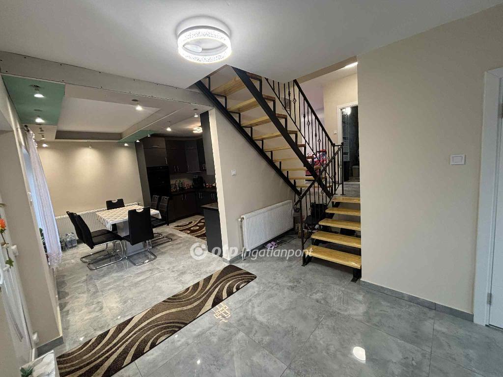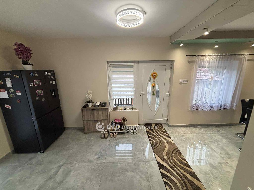 Belépve igényes, letisztult belső tér fogad. A szobákban meleg hatású, tartós laminált padló került lerakásra, míg a konyha és a nappali közös tere látványos, 80×80-as magasfényű, prémium minőségű greslappal burkolt, amely eleganciát és könnyen tisztán tartható felületet biztosít. A teljes ház hangulata friss, modern, harmonikus.