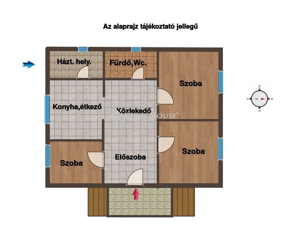 A házban két nagyméretű szoba, egy félszoba, konyha. étkezővel, tágas előszoba, közlekedő, zuhanyzós Wc-s fürdőszoba, és egy háztartási helyiség (gépészet, mosokonyha) került kialakításra.