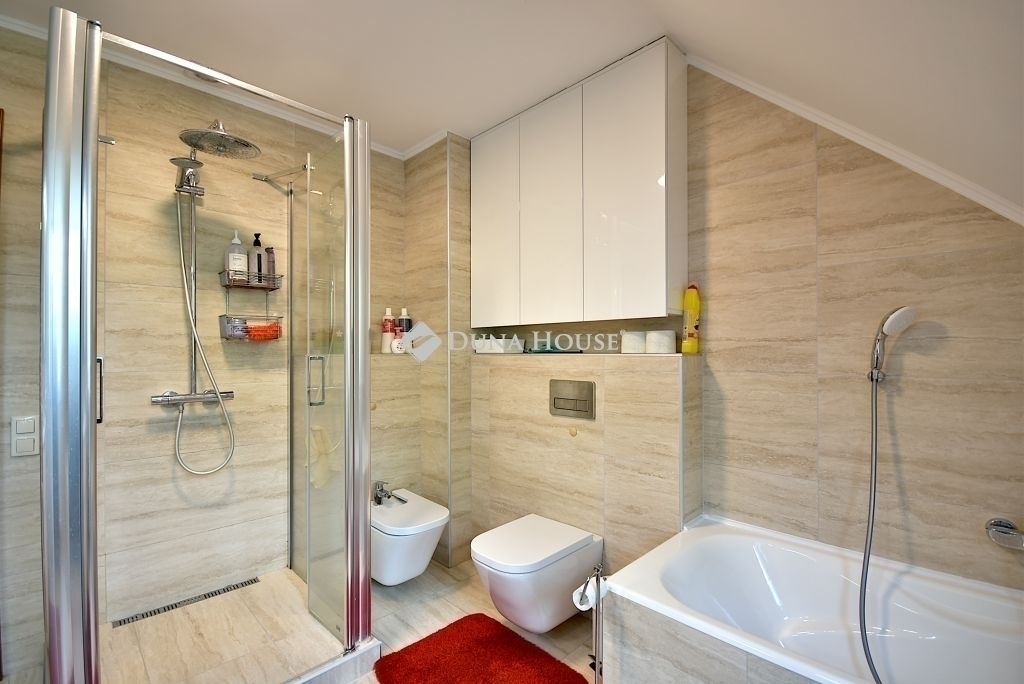 Tágas fürdőszoba: kád, épített zuhany, WC, bidé, dupla mosdó