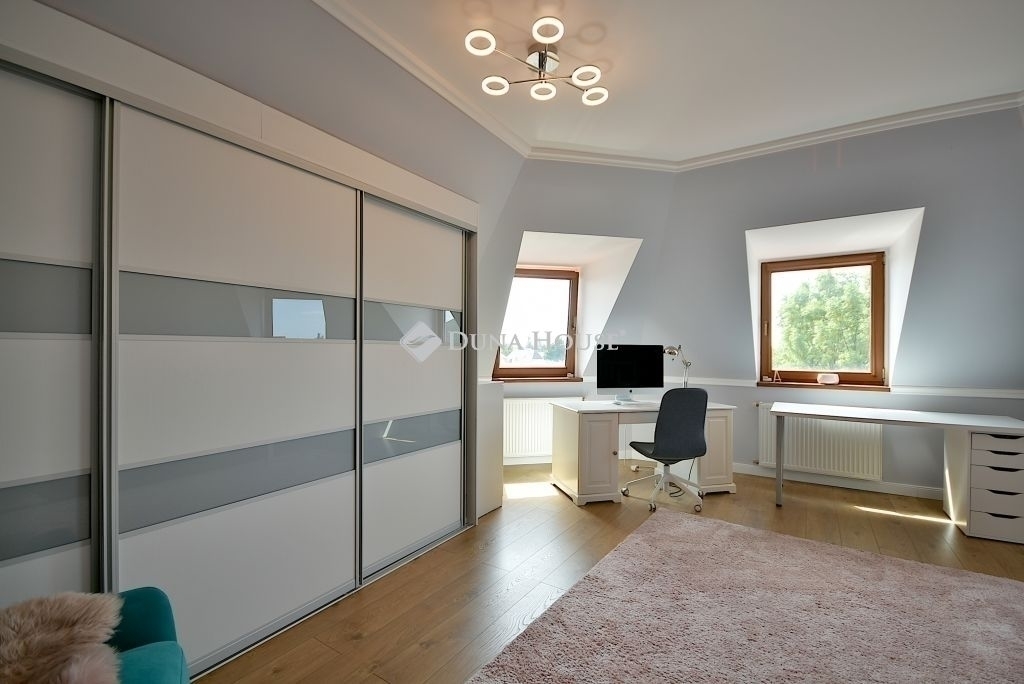 Az ingatlan Érd egyik legkedveltebb részén, 1118 m²-es saroktelken, parkosított, örökzöldekkel körülvett kerttel. A ház 2011-ben épült, három szinten összesen 300 m² lakóteret kínál ideális többgenerációs család részére, de akár cégközpontként, irodaként is tökéletesen funkcionál.