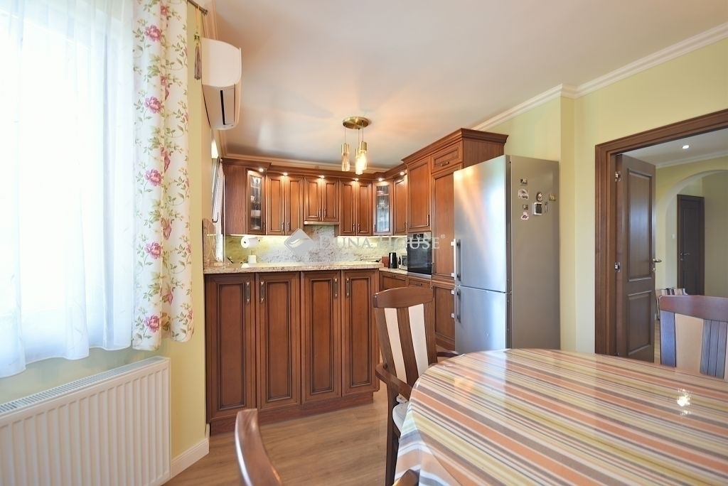 Modern, gépesített konyha: indukciós főzőlap és sütő (BOSCH), mosogatógép (BOSCH), elszívó (AEG), hűtő (Liebherr), beépített étkező, minőségi anyagokkal